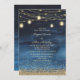 Moderne, elegante und schicke marineblaue Hochzeitseinladung mit goldenem Glitzer, Saitenleuchten und Laternen. Text ist in einem eleganten Skript-Schriftart, der mit dem benutzerfreundlichen Design-Tool von Zazzle vollständig anpassbar ist. Kontaktieren Sie uns für Hilfe bei der Anpassung oder um weitere passende Produkte anzufordern.