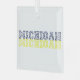 Der blaue Michigan ist oben und Gold darunter. Das Muster in den Buchstaben ist ein Leopardendruck.