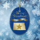 Gib ihnen etwas hübsches vom großen Staat von North Dakota! An der Vorderseite dieses Ornaments befindet sich ein glänzendes goldfarbenes Silhouette-Bild des Staat mit einem dunkleren goldenen Stern. Über dem Staat und Sternbild ist die glitschige Nachricht MERRY CHRISTMAS in Skript, und ein Banner mit dem Text in blau NORTH DAKOTA. Um das Ganze herum gibt es goldene Schneeflocken. Die Bilder und der Text werden auf einem tiefblauen Hintergrund platziert. Auf der Rückseite des Ornaments befinden sich Textfelder in hellem Gold, die Sie anpassen können, und ein zweites goldenes Sternbild. Sie können die Hintergrundfarbe ändern, wenn Sie möchten, indem Sie CUSTOMIZE wählen.
