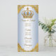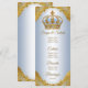 Prince Babydusche Menü mit wunderschöner Babyblau und goldener Krone auf einem eleganten, blau-goldfarbenen Hintergrund. Die Babydusche in Blau- und Goldfarben sind einfach an Ihre Veranstaltung angepasst, indem Sie einfach Ihre Details im Schriftart-Stil und in der Anordnung hinzufügen, die Sie bevorzugen. Sie können die Größe der Krone nach Bedarf anpassen und verschieben.