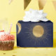 Dieses moderne Galaxie-Design zeigt Imitate mit goldenen Darstellungen von Sonne, Mond, Planeten und Nebel vor einem marineblauen Hintergrund. Das Design umfasst einen mondfarbenen Goldmond, eine lebendige Goldsonne mit Sonnenstrahlen, einen goldenen und blauen Planeten Erde, einen gelben goldenen Saturn mit seinen Ringen und handbemalte Darstellungen von Venus, Jupiter und Mars in Rosa-, Rose- und Gelbgold. Die Gesamtästhetik ist ein Bohemisch inspiriert Universum-Thema mit Himmelsraumelementen.