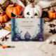 Erleben Sie einen wunderschönen ersten Geburtstag mit diesem gotischen violetten Design. Mit schattigen Blumen, Fledermauskuchen und Vintagen Schädeldetails ist es die perfekte Wahl für ein Halloween-Party mit einem geheimnisvollen, eleganten Ambiente. Vollständig anpassbar für den Anzug Ihrer Veranstaltung.