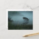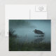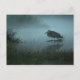 Diese Postkarte enthält ein Foto eines Großen Blauen Helden, der in einem Teich in den frühen Morgennebel angeln.