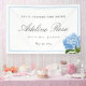 Dieses Vinyl-Banner-Zeichen ist ein charmantes Detail für ein Brautparty oder Verlobung Feiern der Braut zu sein. Vier Zeilen Text in eleganten Schriftart sind leicht zu personalisieren, während eine weiche blaue Hydrangea-Blume und einfache Linie Rand eine Touch von großen Jahrtausende und Hütte Garten Flair.