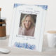 A beautiful and elegant funeral tribute sign to tribute your loved one. Adorned with pretty blue hydrangea flowers with hints of pink. With text "In loving memory". Perfect for a funeral, memorial services, tribute gathering or celebration of life.