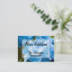 Neue Adressenankündigung mit blauem Hydrangea Hintergrund.