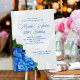 Blaue Hydrangea Geburtstagsfeier Einladung Vorlage. Hellblaue Blumen schmücken die untere Ecke dieser Blumengrafik. Schwarzer Text mit blauem Party im Skript gedruckt. Große Blume erzeugen ein strukturiertes Aussehen hinter dem Text und auf der Kartenrückseite.
