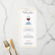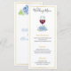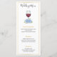 A 4" x 9" wedding menu featuring watercolor blue hydrangeas and a glass of red wine, elegantly framed in gold. The menu includes options for Hors D'oeuvres, Entrées, and Desserts, and the reverse side is customizable with the bride and groom’s names.