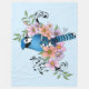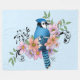 Ein blauer Jay-Vogel umgeben von rosa, lila und pfirsichfarbenen Frühlingsblumen Set vor einem hellblauen Hintergrund.