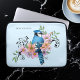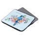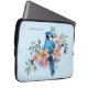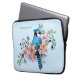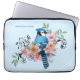 Ein blauer Jay-Vogel umgeben von rosa, lila und pfirsichfarbenen Frühlingsblumen Set vor einem hellblauen Hintergrund.