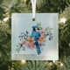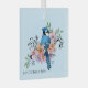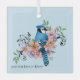 Ein blauer Jay-Vogel umgeben von rosa, lila und pfirsichfarbenen Frühlingsblumen Set vor einem hellblauen Hintergrund.