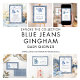 Blue Jean Denim Girl Gingham Baby Shower. Available digitally and printed. Celebrate the mom-to-be with this sweet design with a blue denim baby clothes theme and gingham background.. A Blue Jean Baby is in a set modern script. Easily personalise the rest of the words as required.