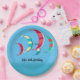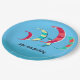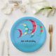 Sommerlich blaue Kite Surf Thema Papier Teller mit anpassbarem Text. Farbenfrohe Drachen in Rot, Blues, Gelb und Grün schmücken die Teller.