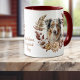 Ein hübscher Herbstkranz in den Farben Zimtbraun, Bräune und Creme umgeben das Aquarellbild eines Blue Merle Australian Shepherd Dog. Das Bild wird zweimal auf der Tasse gedruckt, wobei der eigene Text dazwischen liegt.