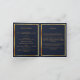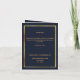 Un programme élégant de 4 pages. Un arrière - plan bleu foncé, un cadre faux or, et l'espace pour votre photo sur le devant. Personnalisez et ajoutez le nom, les dates et votre texte.