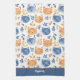 Die zauberhaften, blauen und orangefarbenen Katzengesichte bilden ein niedliches Muster auf diesem Küchentuch. Zusammen mit den Katzengesichtern sind passende Blätterbilder. Der Boden des Handtuches hat einen passenden blauen Rahmen mit Ihrem Namen oder Text in Weiß.