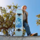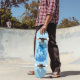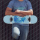 dekoratives Design eines blauen Orca oder Killerwals, der auf einem Skateboard aus dem Wasser springt