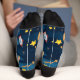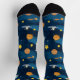 A whimsical and colorful seamless pattern featuring adorable watercolor illustrations of celestial objects on a dark blue night sky background with soft cloud effects. The design includes happy planets, rockets, a UFO, shooting stars, and asteroids, making it perfect for children's decor, apparel, fabric, accessories, and other print-on-demand items. This design is great for space lovers of all ages.