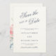 Diese schöne Hochzeit speichert die Dattelkarte mit einem einfachen, minimalen Text-Design, mit schönen blauen und rosa Aquarellbeinen auf der Rückseite. Wir haben Kunst aus LABFreations benutzt.