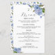 Romantische Speisekarte für Hochzeitsessen mit Aquarellbildern von blauen Blume mit Grün.