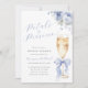 An elegant bridal shower invitation featuring delicate blue florals and a sparkling prosecco glass accented with a soft blue bow. The graceful script typography and airy layout create a refined and romantic atmosphere, perfect for a chic “Petals & Prosecco” celebration.