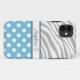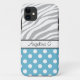 Personnalisé iPhone 5 coque personnalisé avec votre nom, et conçu avec un motif de pois bleu et blanc et un motif d'impression zèbre défraîchi avec bandes zèbres grises et blanches.