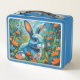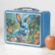 Ein blaues Kaninchen schlängelt sich zwischen orangen und blauen Blumen auf der köstlichen Kids-Lunch-Box.