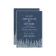 Elegant rustic winter wedding invitations in navy blue and white with a beautiful snow covered night forest and sophisticated text.
