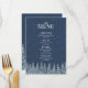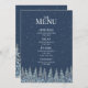 A rustic winter wedding menu with a beautiful snow covered evergreen forest at night in dark navy blue and white.