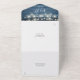 Alles in einer Hochzeitseinladung mit hübschen Saitenlichtern, handgezeichnet Blumengarten und schicker Typografie auf blauen rustikalen Holzpaneelen. Die Einladung enthält eine perforierte RSVP-Karte mit Ihrem Hochzeitswebseiten QR Code und Details. Entwickelt von Thisisnotme©