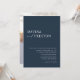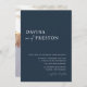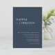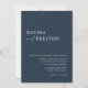 Foto Hochzeitseinladung mit Ihren Namen in eleganten Serifen fett Schriftart mit "und" und "Empfang zu folgen" in modernen handgeschriebenen Schriften, die über einen eleganten Navy Blue Hintergrund schreiben. Personalisieren Sie Ihre Hochzeitsdetails unten. Fügen Sie dem Rücken ein vollblütiges vertikales Foto hinzu, um eine zusätzliche persönliche Touch zu erhalten.