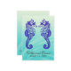 Die Hochzeitsfeiern am Strand oder am Zielort haben zwei Seepferde über einem Meereshintergrund mit Wellen in einer zeitgenössischen blauen, braunen und weißen Farbpalette sowie Textfeldern, die Sie nach Ihren Wünschen anpassen können.