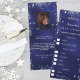 Geburtstagsmenü Karte. Personalisieren und fügen Sie einen Namen, Alter, Datum und das Menü für Ihre Gäste zu wählen. Marineblau, mit Imitaten verziert mit Silberstaub aus Glitzer. Die blaue Farbe ist ungeschehen. Weiße Buchstaben. Zurück: Fügen Sie ein Foto des Geburtstagsmädchens hinzu, lustige Fakten und Namen.