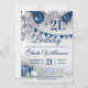Ein stilvolles Design für eine Party Einladung zum 21. Geburtstag. Blauer und silberner Ballon und Pennant mit blauem Text. Alle Texte können bei Bedarf geändert werden