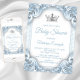Blauer und silberner Prinz Baby Dusche Einladungen mit schöner Krone auf einem eleganten Baby blau und silber wirbeln Hintergrund. Diese wunderschönen blauen und silbernen Prinz-Babydusche-Einladungen lassen sich einfach an Ihre Veranstaltung anpassen, indem Sie einfach Ihre Details in den Text Ihrer Wahl im Schriftart-Stil hinzufügen, den Sie bevorzugen.