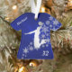 Cet ornement de vacances est doté d'un joueur de basketball en silhouette argentée qui trempe la balle devant un jet de flocons de neige en argent orné. L'image est placée sur un arrière - plan bleu profond dégradé. Votre texte personnalisé est en argent sur la manche gauche, et en bas à droite. Le dos de l'ornement a le même arrière - plan bleu et des flocons de neige, et des champs de texte supplémentaires pour vous de customiser. Parfait pour le joueur de basket ou le fan.