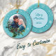 An der Vorderseite dieses Holiday-Ornaments befindet sich Ihr eigenes Foto, das in einem blau-weißen Schneeflockenrahmen eingebettet ist und mit einem hübschen, heiligen und immergrünen Hut dekoriert ist. Rote Beeren und Kiefernfüße betonen die heiligen und kiefernroten Früchte. Die Rückseite des Ornaments hat den gleichen Hintergrund und Kreis mit Ihrem benutzerdefinierten Text in blau. Ein wunderbares Familiengeschenk für Neuvermählte, Neugeborene oder zum Gedenken an dieses besondere Ereignis im vergangenen Jahr.