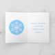 Die Vorderseite hat eine weiße Schneeflocke auf einem eisblauen Hintergrund mit "Frohe Weihnachten" von der Familie um sie herum. Die Innenseite hat eine Wiederholung der Schneeflocke und eine Meldung in passendem Blau.