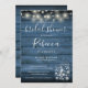 Eine rustikale Brautdusche mit hübschen Saitenleuchten und Maurerkirschen mit stilvoller Schriftzypografie auf blauem rustikalem Holzhintergrund. Entwickelt von Thisisnotme©