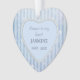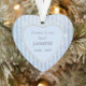 Ce magnifique ornement commémoratif met en vedette votre photographie dans un cadre en forme de coeur de bijou glacé. Le cadre est placé sur un arrière - plan de flocons d'argent sur un arrière - plan rayé bleu ciel. L'autre côté de l'ornement a le même arrière - plan rayé de flocon de neige avec votre texte personnalisé en bleu gris sur un coeur bleu clair solide. *Veuillez noter que l'image est imprimée et ne contient ni bijoux ni métal.*