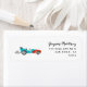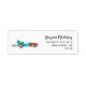 Niedliches und lustiges Retourenlabel mit Aquarellbildern eines blauen Vintagen Rennwagens mit roter Flammenkunst, ideal für Babydusche und Geburtstagspartys.