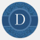 Dieser Aufkleber mit seinem zeitgenössischen blau-weißen Design mit Retro-Ambiente, Damast-gemustertem Hintergrund und Monogramm-Band ist eine elegante Art, Ihre Hochzeitseinladungen oder Gastgeschenke Hochzeiten zu verkleiden.