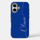 Blue White Elegant Calligraphy Script Custom Personalisiert Name iPhone 16 Smart Phone Cases zeichnen sich durch ein modernes und trendiges, einfaches und stilvolles Design aus, mit Ihrem personalisierten Namen in eleganter handgeschriebener Schrift Typografie auf blauem Hintergrund. Entworfen von ©Evco Studio www.zazzle.com/store/evcostudio