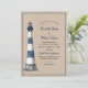 Ein rustikales Design mit einem handgezeichneten Leuchtturm in Blau-Weiß-Farbe. Die helle kraft-Hintergrundtextur ist nur ein Bild, nicht Papier. Die Rückseite hat Streifen. Der Text ist blau und schwarz mit Pinselskript, Farben und Schriftart sind anpassbar.