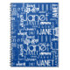 Dieses Notebook weist ein Namensmuster in verschiedenen Schriftart (Wortwolke) in Weiß auf blauem Hintergrund auf. Personalisieren Sie mit Ihrem Namen oder jemandem Besonderem.