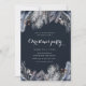 Winter Foliage Illustration oben und unten in Grautönen und Blau gepaart mit einem weißen Skript für alle Ihre Informationen auf einem dunkelblauen Hintergrund. Karo unseren Laden für mehr Weihnachten Party Einladung Optionen.
