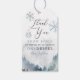 Eleganter Winter Babydusche-Lieblingsplatz mit Aquarellbildern von blauen Bergen mit Kiefern mit Schneeflocken. Im Text steht: "Vielen Dank, dass Sie viel geschneit haben, dass Sie meinen 1. Geburtstag zum ersten Mal erleben." Ideal für den 1. Geburtstag eines Jungen.
