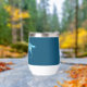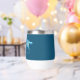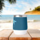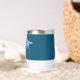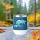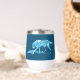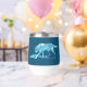 Ein stylisierter blauer Wolf (Canis lupus) wirft einen Schatten, wenn er durch schneebedecktes Gelände geht. Passen Sie Ihren eigenen Text auf der Rückseite an.