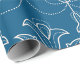 Unrolled and flat sections of blue wrapping paper with white floral patterns. The elegant design conveys a sophisticated and classic tone.