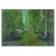 Ein überwucherter Weg, der an einem sonnigen Sommertag durch den Birkenwald schlängelt. Im Schatten der Bäume häufen sich Teppiche von Bluebells in Blautönen und lila im Kontrast zum Frühlingsgrün des Grases und Birken.